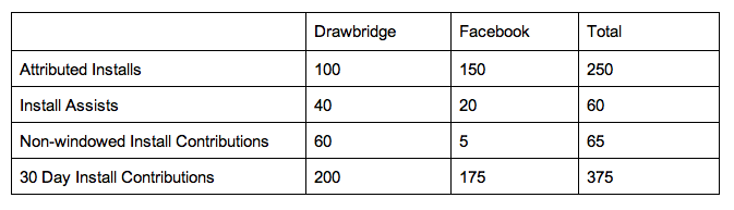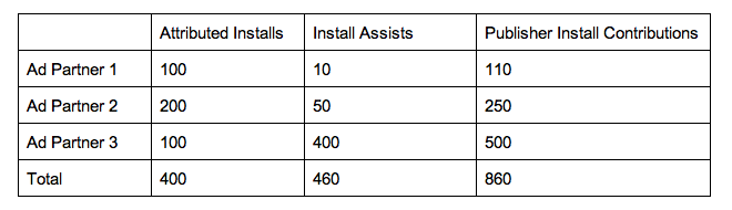 Note that there were only 400 mobile app installs by new users in the above. There were an additional 460 Install Assists. Don’t make the mistake of thinking that Publisher Install Contributions is the total number of mobile app installs by new users since it’s not. Also, if we only allowed one assist per attributed install, then Install Assists would never be greater than Attributed Installs. However, we credit as many assists per Attributed Install as advertising partners involved. Thus, Install Assists can be many times greater than Attributed Installs.