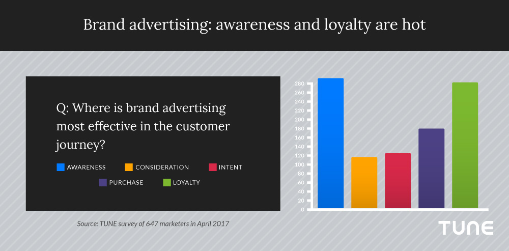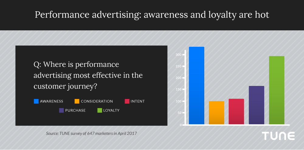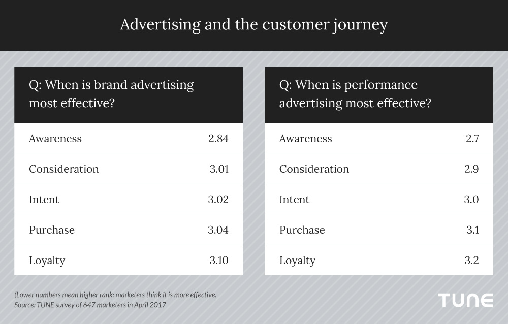 Clearly, marketers are thinking that brand advertising and performance marketing rank equally in the traditional awareness stage of the customer journey.