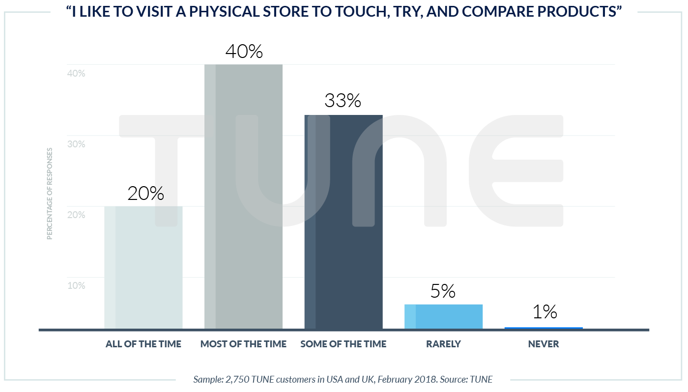 Around 3 in 5 people, or 61%, like to visit a physical store to touch and try products, or to get quick exchanges, all of the time or most of the time. Only 6.4% rarely or never want to go to a store.