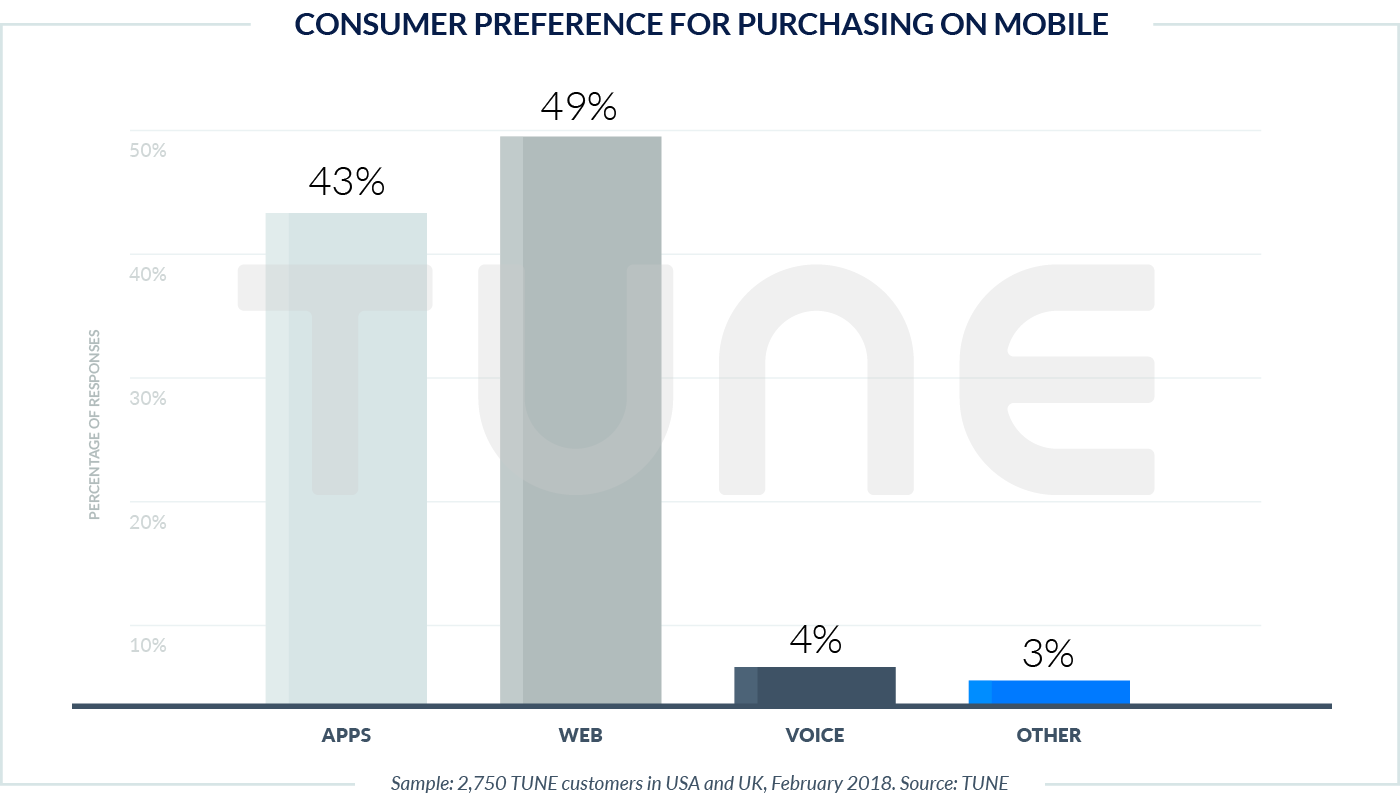 Consumers are split almost down the middle when it comes to making purchases on mobile, with a slight preference for using mobile web (49%) versus apps (43%). Interestingly, while the numbers are still close, that preference is reversed for younger people: Consumers ages 14 to 34 prefer apps to mobile web, 50% to 44%.