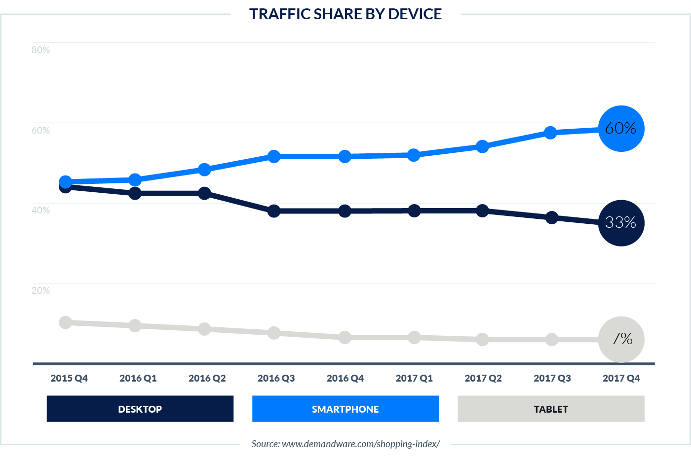 Mobile web traffic surpassed desktop in late 2016. In the U.S., smartphone traffic to retail sites starting passing desktop in late 2017. Add in tablets, and mobile traffic to retail sites is as high as 56% and growing, while desktop traffic is as low as 44% and dropping.
