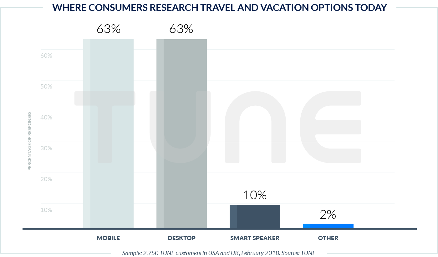 Desktop ranks second to mobile on the research phase, as we see above, but that changes when people are researching complex purchases like travel and vacation options, where it’s neck and neck with mobile: 62.8% of our 2,750 respondents said they researched travel on their phones; 62.65% said they did so on their desktop computers.