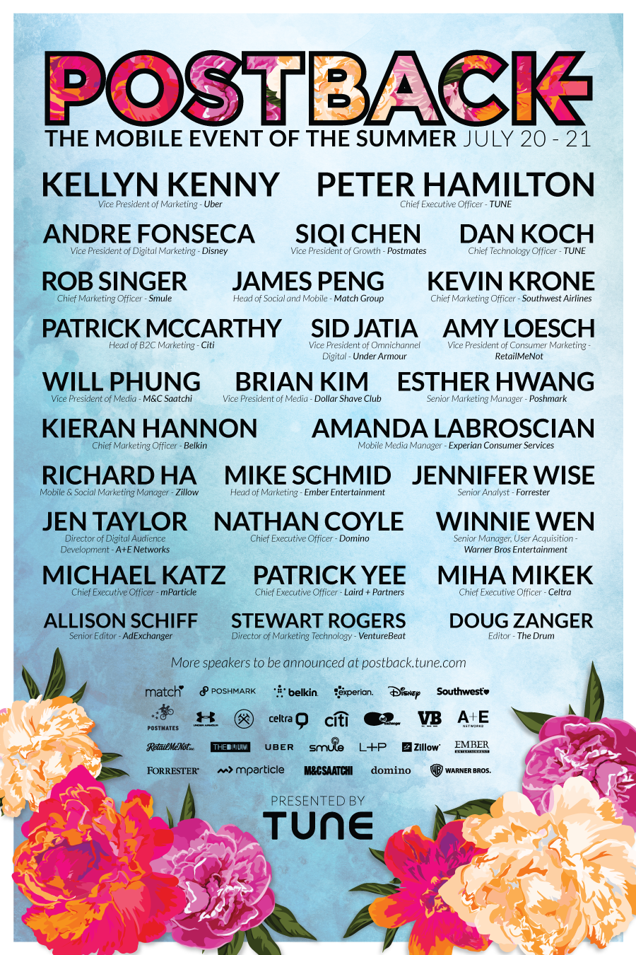 There is no open call. All our speakers are personally asked to share their ideas and advice on the main stage at Postback. This group of industry leaders and TUNE customers represent leading brands and technologies that are moving the industry forward.