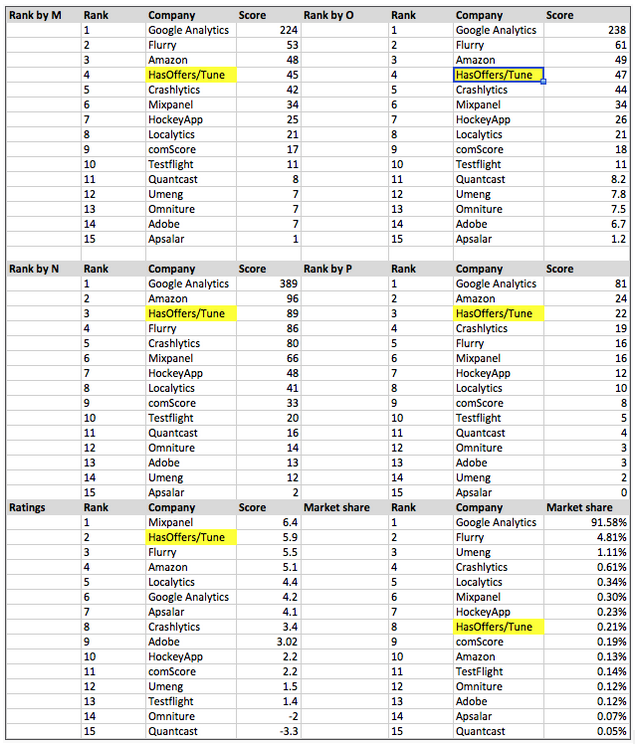 The VB study ranked analytics apps seven distinct ways, weighting factors in a different way each time. And in each instance, TUNE ranked near the top. To quote a brief excerpt from the report: