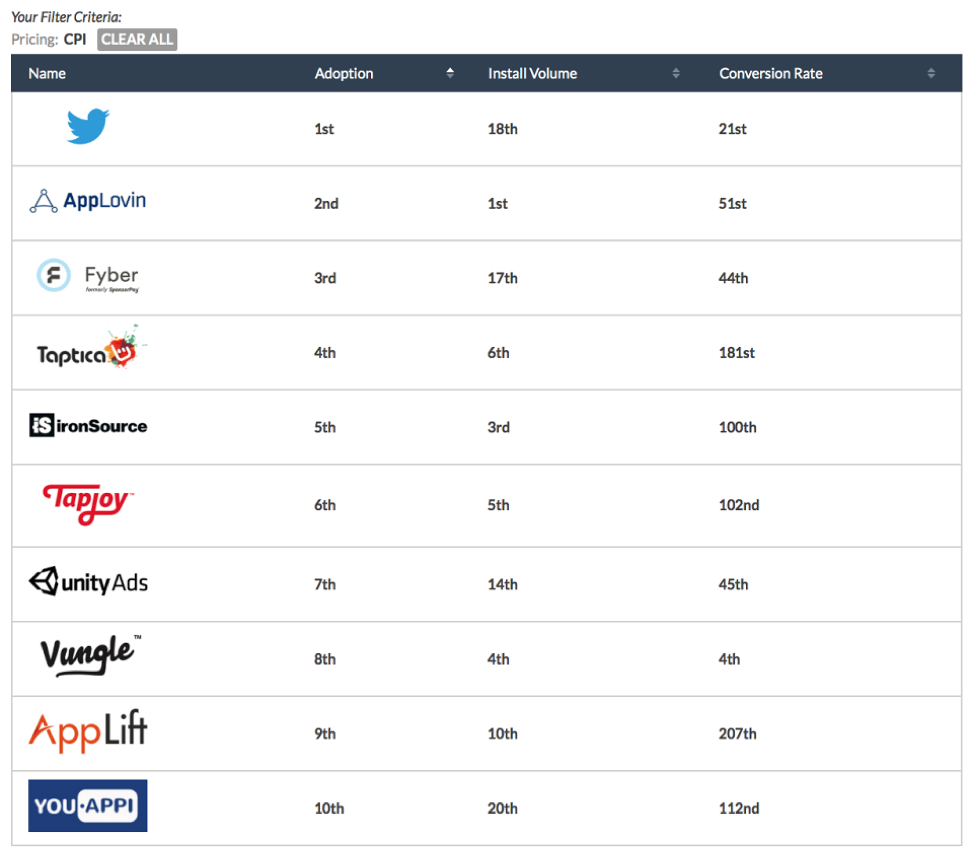 Let’s take a look at partners with the search criteria of Cost Per Install (CPI). Marketers use this criteria to see which advertising partners TUNE customers use when buying on cost per install. The Mobile Advertising Index filters more than 1,000 advertising networks and publishers, so you know you’re truly getting an accurate picture of top partners. Here are the top 10 advertising partners TUNE clients use for buying with a Cost Per Install option: