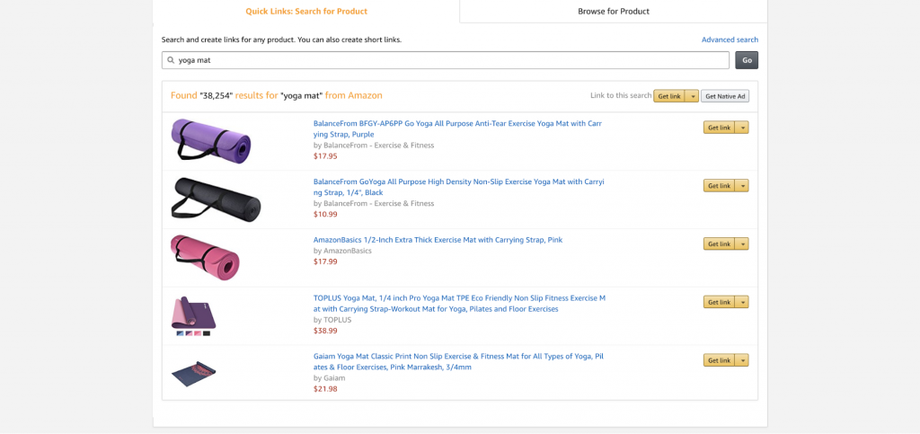 Affiliates can also search within the dashboard for the products they want to promote. Amazon makes it easy to swipe images, links, and HTML to feature their products. As you can see below, a simple search for yoga mat returns a variety of options where affiliates can easily scroll to find the product they are looking for and get the link to recommend.