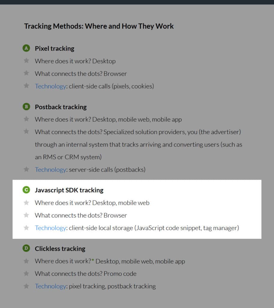 We still recommend using server-side postback tracking as your bread and butter. Other tracking methods, including the JavaScript SDK, simply can’t compete with the accuracy and reliability of postbacks.