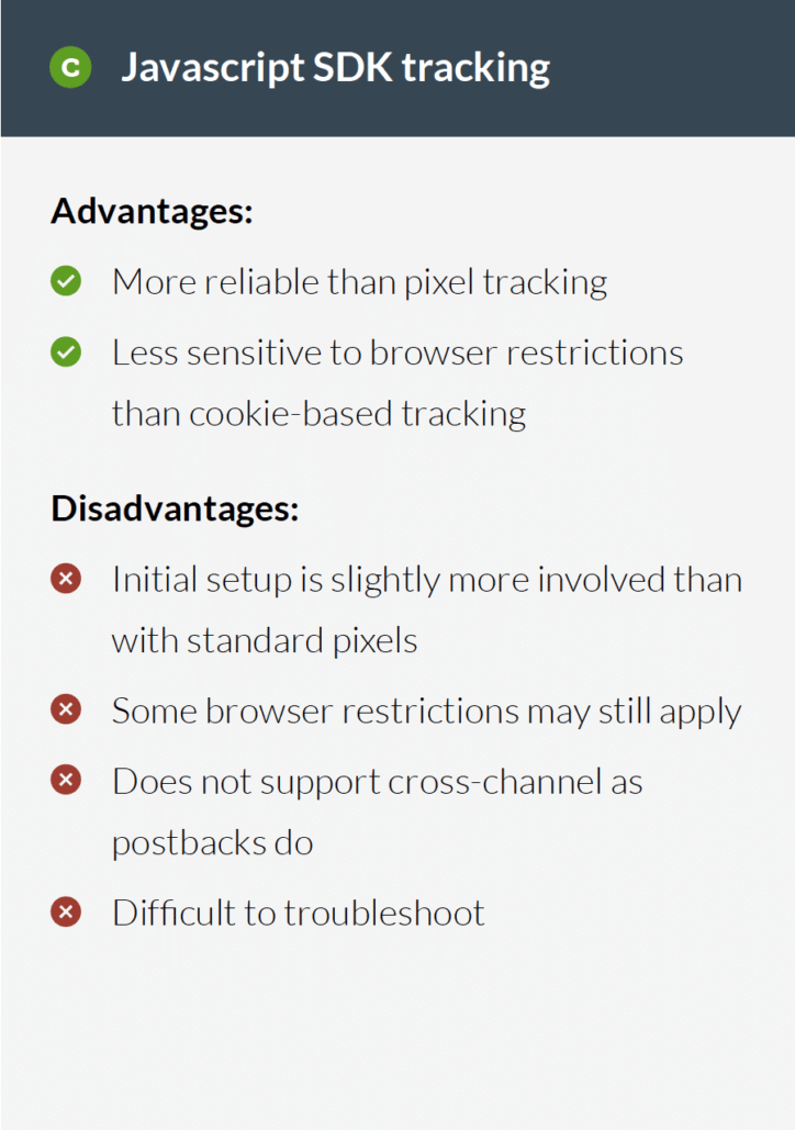 JavaScript SDK tracking still needs a web browser to do all the work. That means it’s still susceptible to some of the same risks and limitations as traditional pixel tracking.