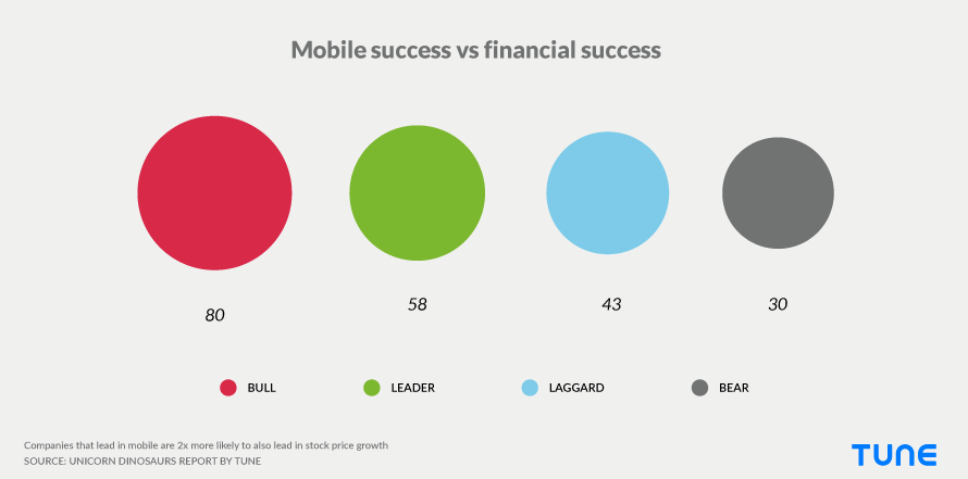 However, the firm is almost 2X more likely to be a financial bull or leader, compared to mobile bears. In fact, 65.4% of companies that demonstrate financial success are also leading their business category in mobile customers.