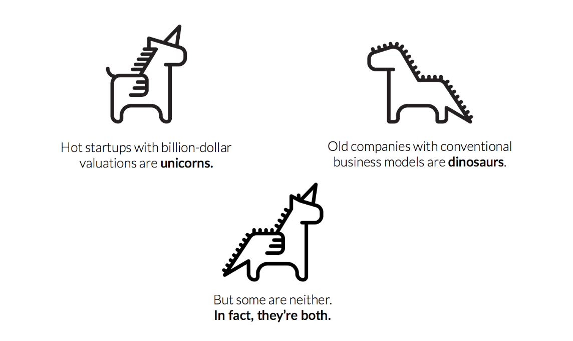 Hot startups with billion-dollar valuations are unicorns. Old companies with conventional business models are dinosaurs. But some are neither.