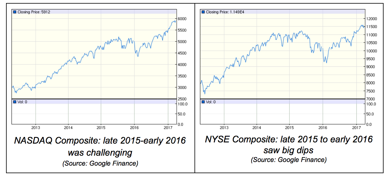 For the 12-month period ending in October 2016, average Fortune 1000 stock market valuation change was a very slight lift: 3.3%. In other words, late 2015 and early 2016 was a fairly tough time, economically speaking, before the stock market rebounded mid-year: