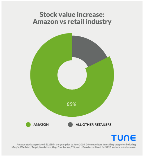 Google has over 73 billion mobile users in aggregate, and Facebook has just over 6 billion. Both grew fast in 2016: 18.5% and 35.4%, respectively. And Amazon, with more than 4X the number of mobile users than the entire rest of the retail industry, captured almost $102 billion more stock price growth than its competitors.